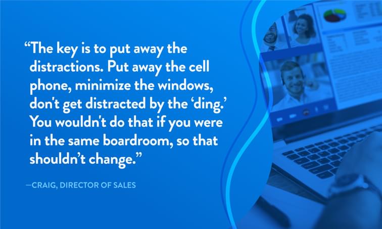 Share your screen with data and references - Use screen sharing to show relevant documents to support your discussion and ensure that you’re both on the same page. Don’t over-rely on this method because you will still want to see each other face to face as much as possible.